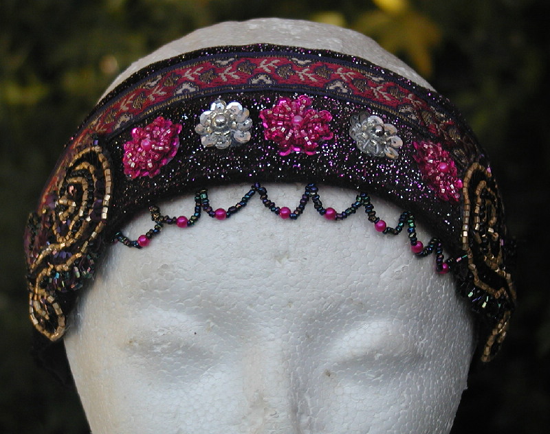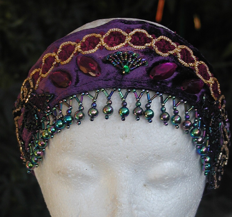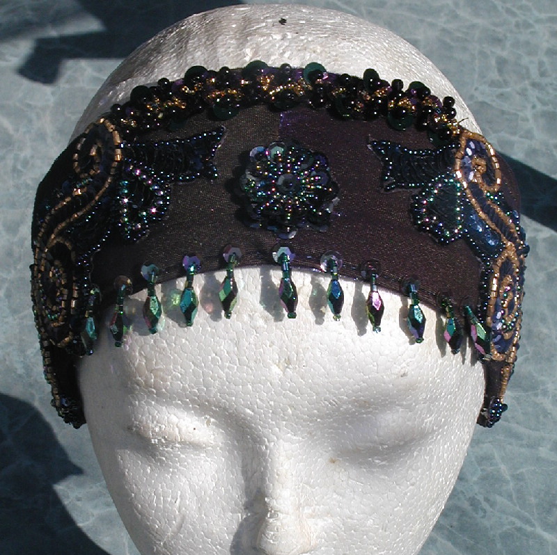 While Bahira was finishing Maia's Red Horus bedlah, Maia asked if she could make headbands for all the bedlahs Bahira had made for her up until then. These three headbands were created to match Maia's Bilingual bedlah and the blue/green bedlah.