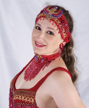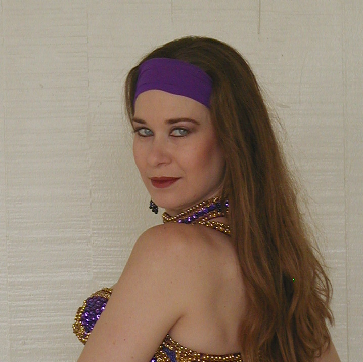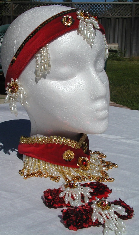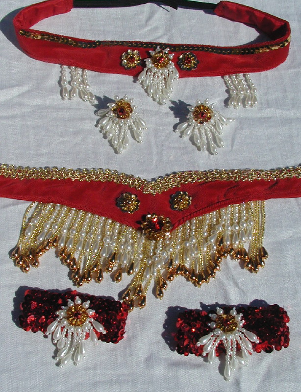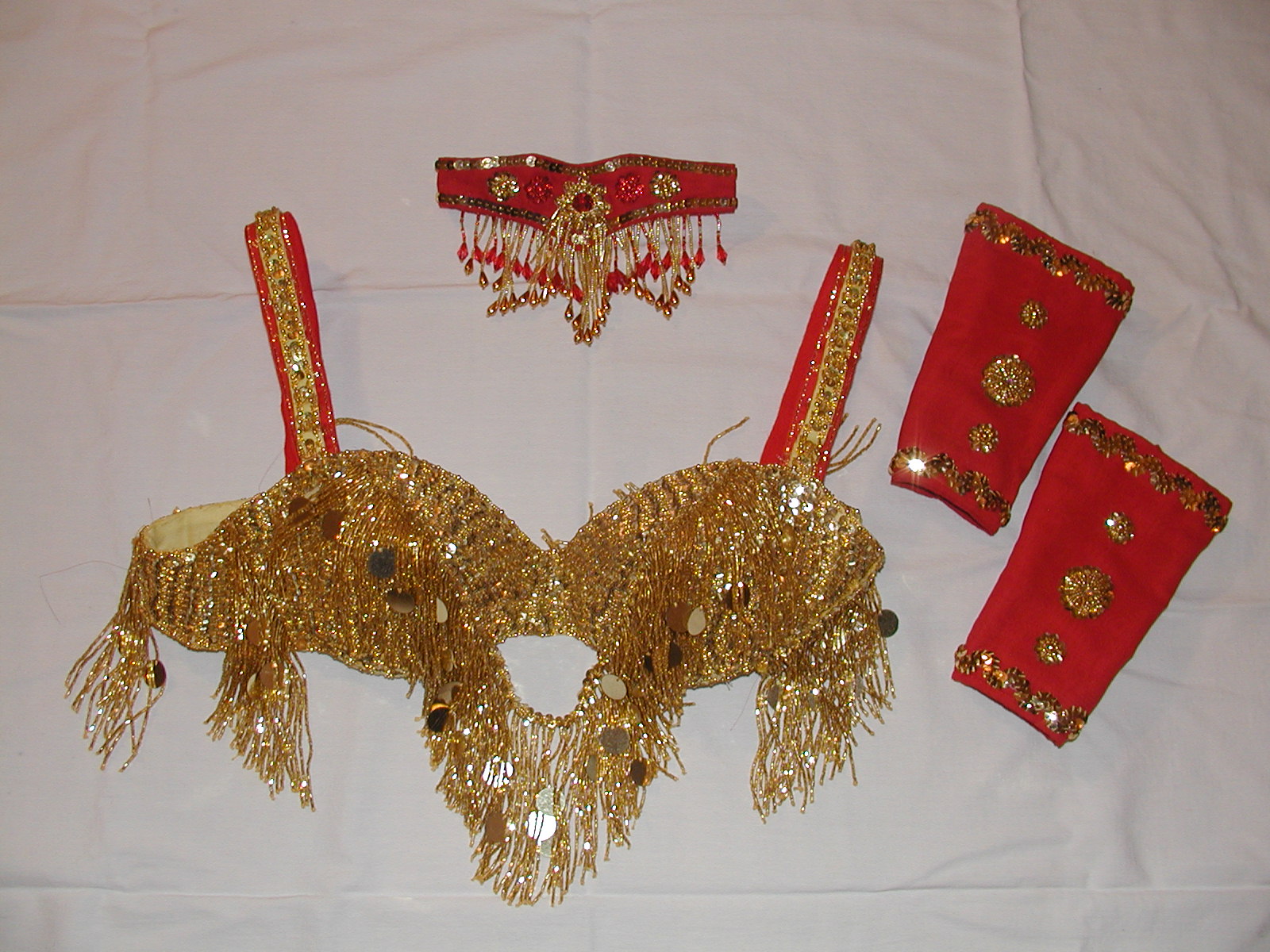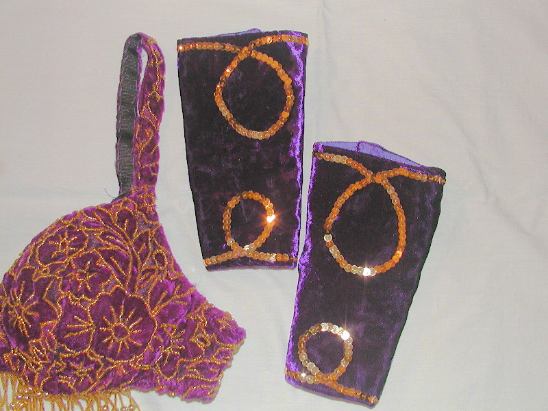 Alcina needed gauntlets for a gold and purple velvet costume she had. She also needed gauntlets and a necklace for a red and gold skirt. The gold bedlah she wore with the red skirt was mono-toned gold and did not look good against her skin. She need a touch of red on the gold bra to break up the line. Bahira added a red under-strap to the gold bra strap to achieve this. Here are the results.