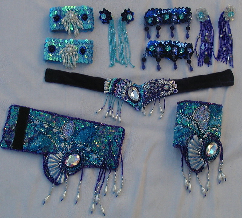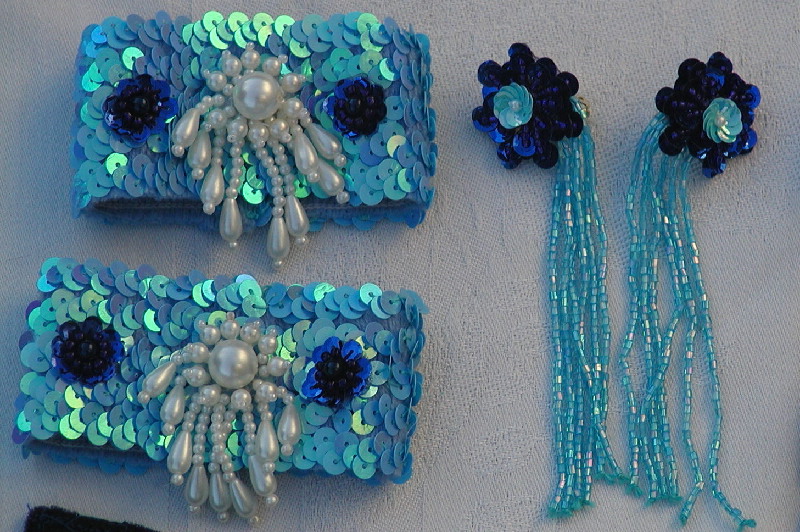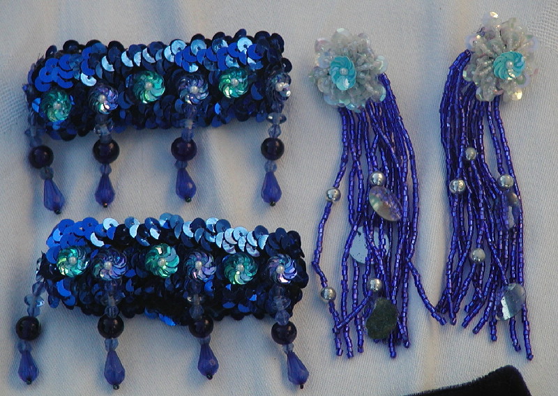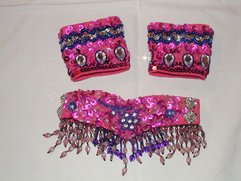 The first one was a richly sequined and beaded, hot pink, cobalt blue and silver number (left) which needed cuffs and a necklace. There were no extra materials to draw from, so Bahira had to search out and match the colors independantly. She also had to duplicate the complex wavey design of the bead work. Here are the results.
