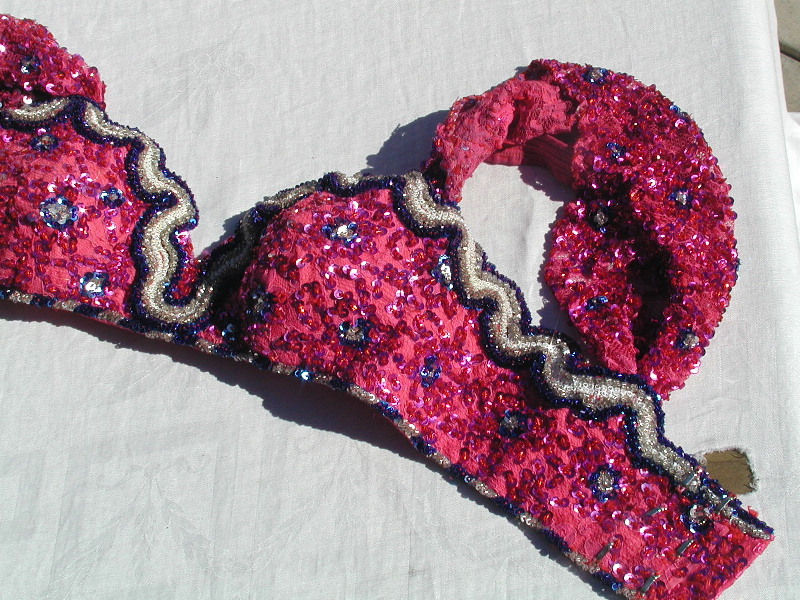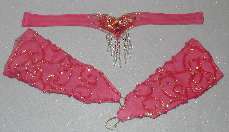 Alcina had an existing pink bedlah for which she did not have any necklace or gauntlets. She had been borrowing a necklace from another bedlah but the shade of pink was not right. The existing bedlah had two sequined chiffon sleeves which she never wore and she asked Bahira if those could be used in any way. Bahira incorporated the sequined part of the sleeves for the gauntlets and the plain part was used as a base for the choker type necklace.