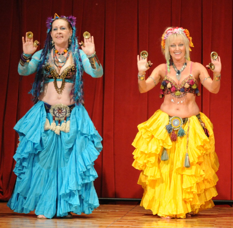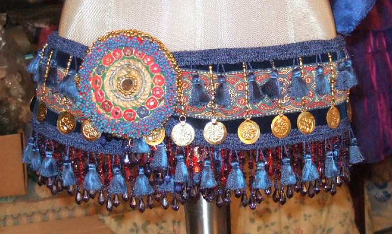 Left: Bahira and Shiva wearing Mandala pins on the front of their tribal belts. Right: Cobalt Tribal Night Out Belt - Mandala can be placed anywhere along the belt.