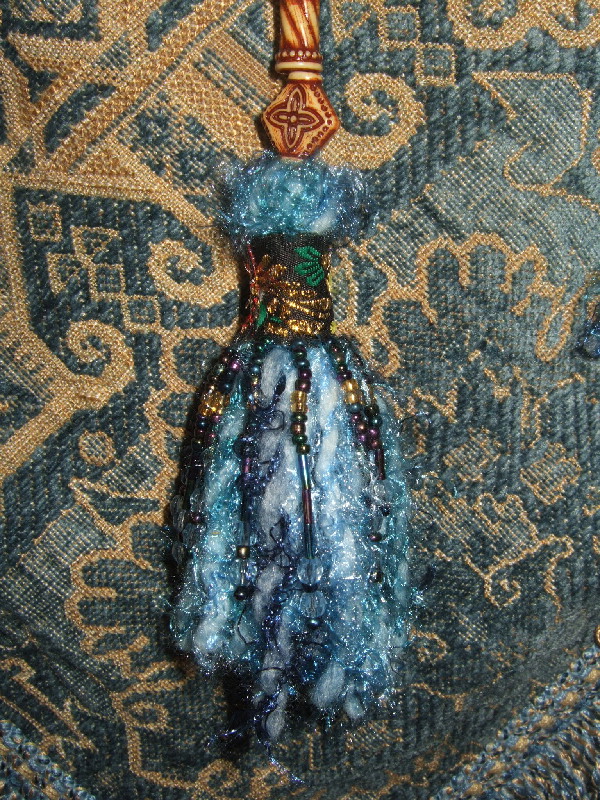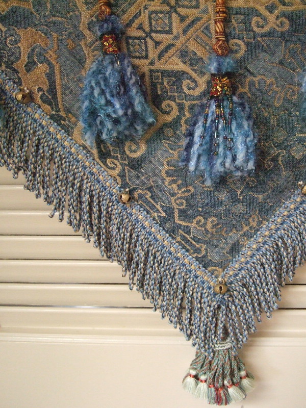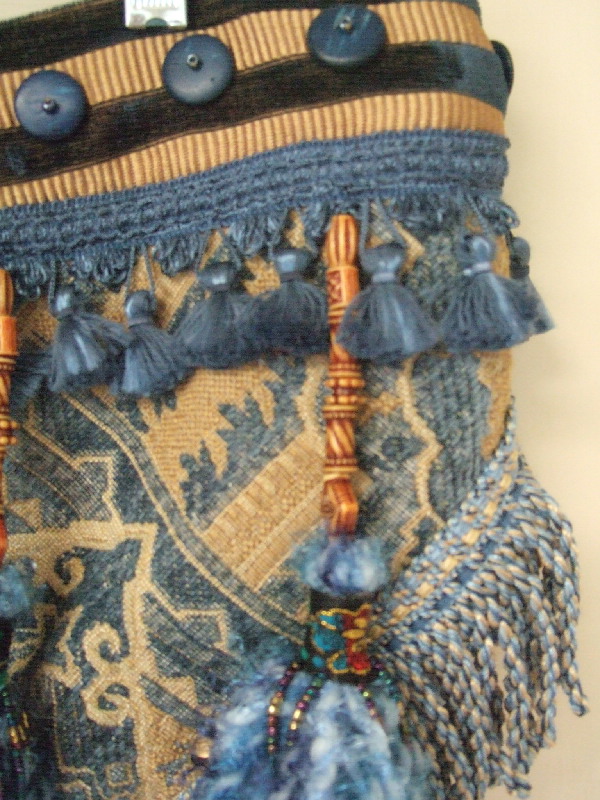 The pattern on this fabric is a geometric weave in sky blue chenille and earth-tone accents. Brass bells line the border fringe and blue dyed wood discs accent the darted hip band. Fuzzy hand-made beaded tassels add a lightness to this earthy tribal belt. Shorter tassel ties make this belt more suitable for medium to medium small hips.