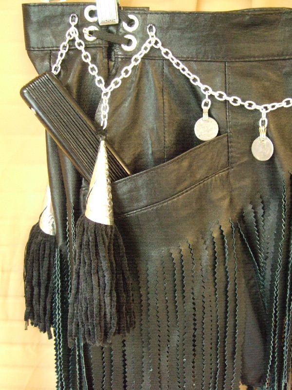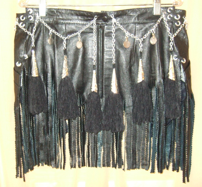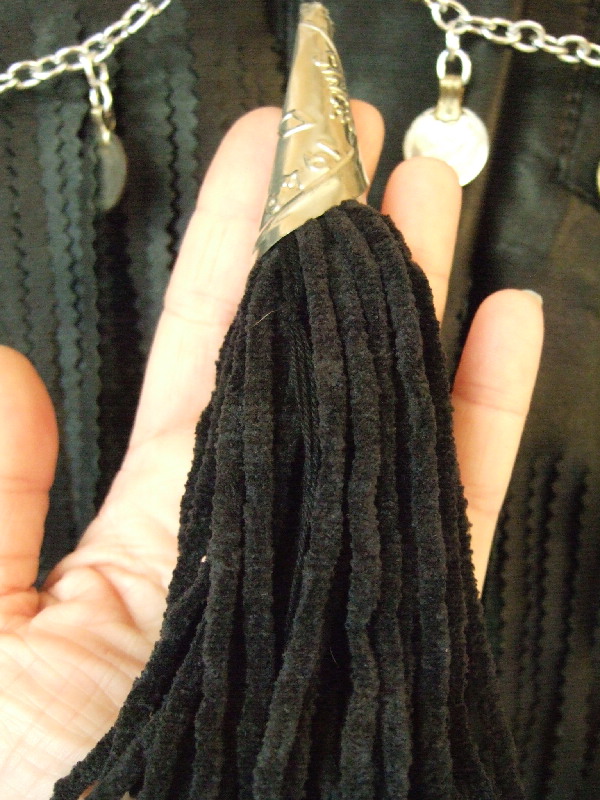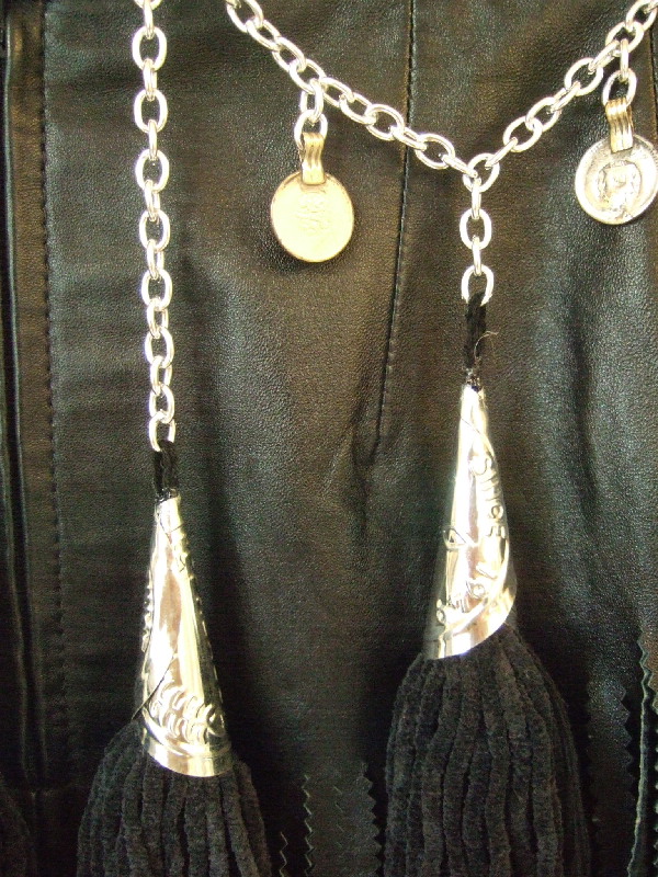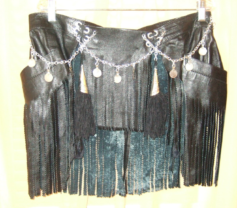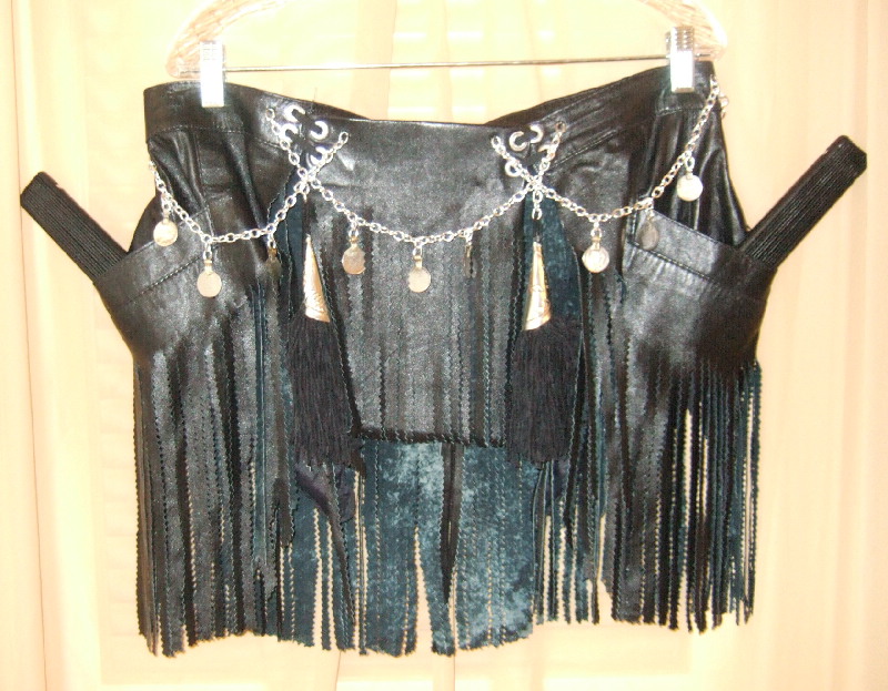 This belt has two subtle holster pockets on each side to slip zills into or to hold a fan or two until needed. The belt fits a 42 or larger hip and is expandable at the four elastic grommet closures. The belt zips and snaps close in the back so no untying or stretching of elastic is necessary to wear. Eight luxurious micro-suede tassels hang from the chains along with kuchi coins. A matching bra top can be made from the remaining leather pieces and hardware.