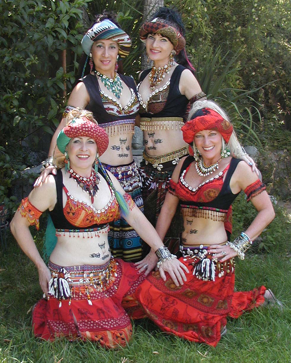 Using fabric with tribal patterns and designs, Bahira created a look unique to troupe Nambah. The easy-to-wrap turbans were created using her own "Insta-Turban" design and the hand beaded belts are soft and form-fitting. The use of lots of cowry shells, glass beads and tassels give these costumes a primitive look. Each of the necklaces were made by Bahira for each member to compliment her costume.