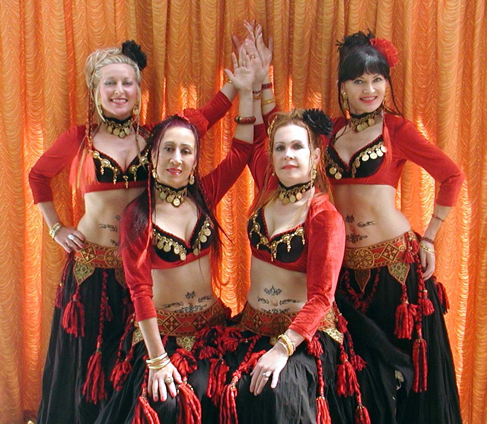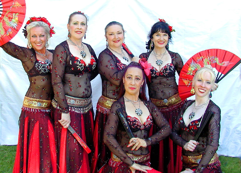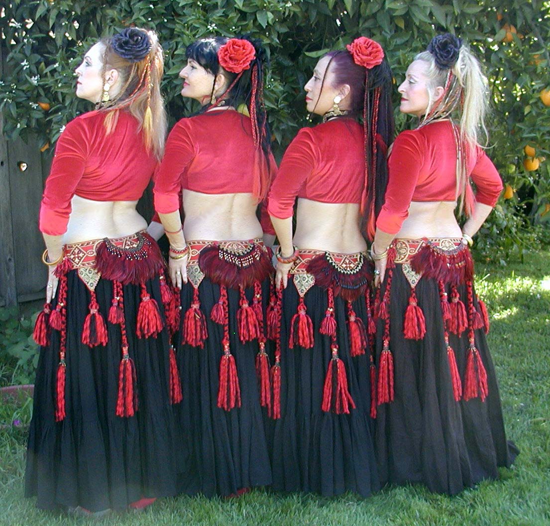 Bahira designed the next troupe costume with an eye towards a more formal, elegant look with Flamenco overtones. All the belts were handcrafted by her from 4-inch wide metallic brocade ribbon trim with the addition of red and black chenille tassels also made by Bahira.