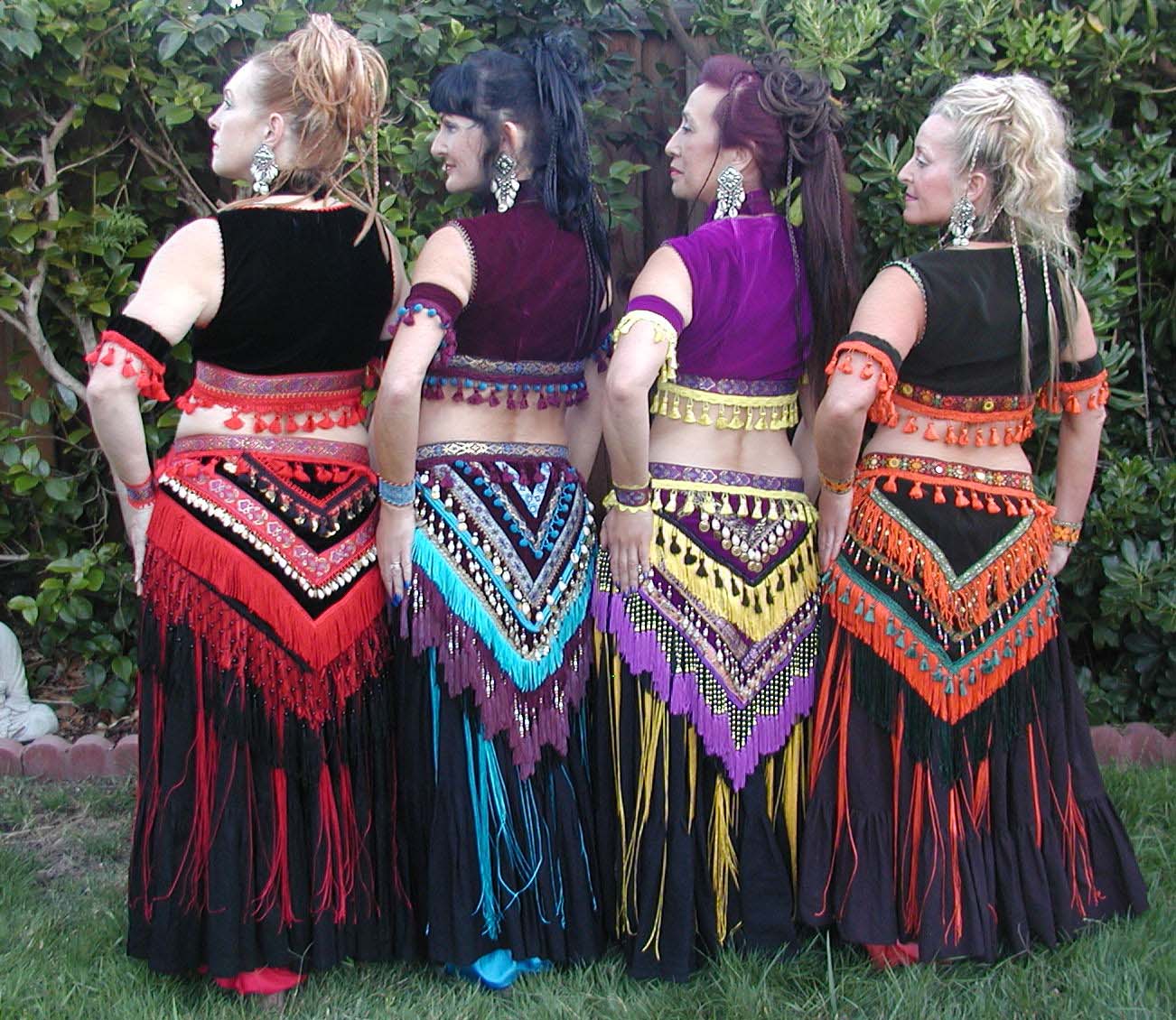 Bahira designed these costumes to fit a lively set of dances using lots of turns and skirt work. The triangular shape of the belt echoes the casual tie-on gypsy scarf, but the addition of layers of fringe, beads, ribbons and coins makes this uniquely Nambah's style. The back of the belts assure that the Troupe looks as good from the back as from the front!