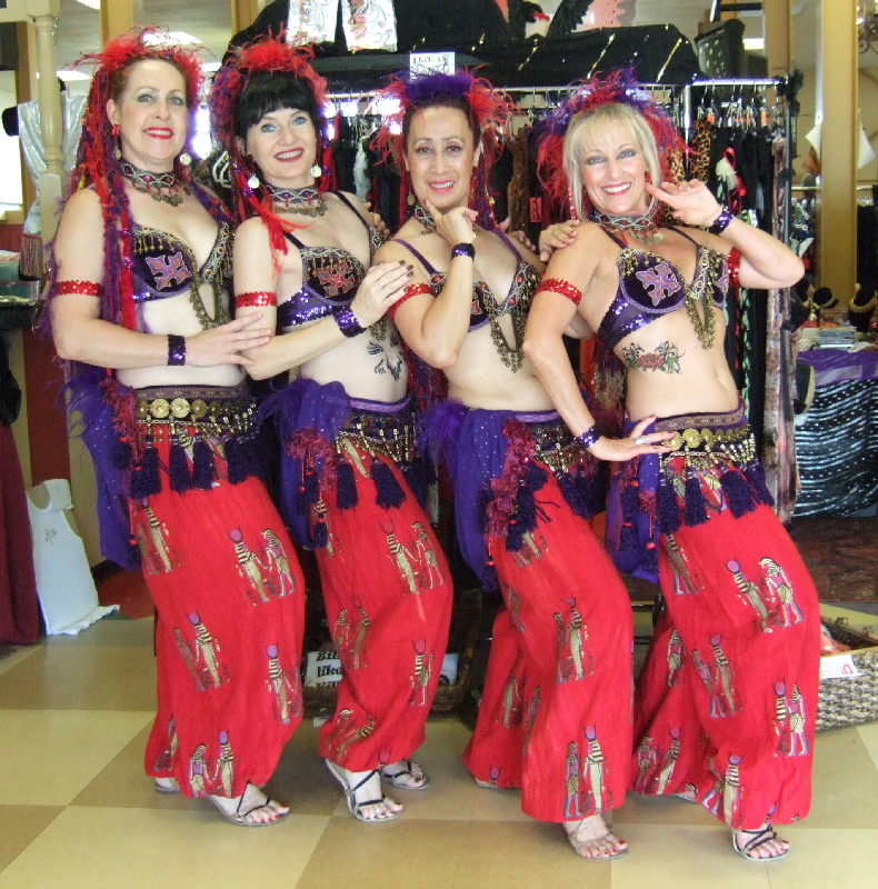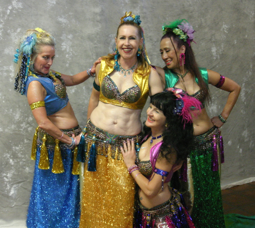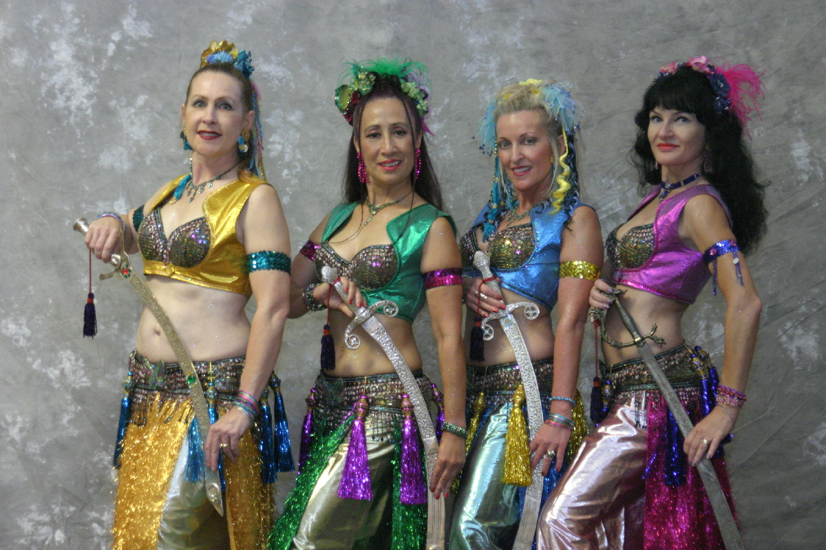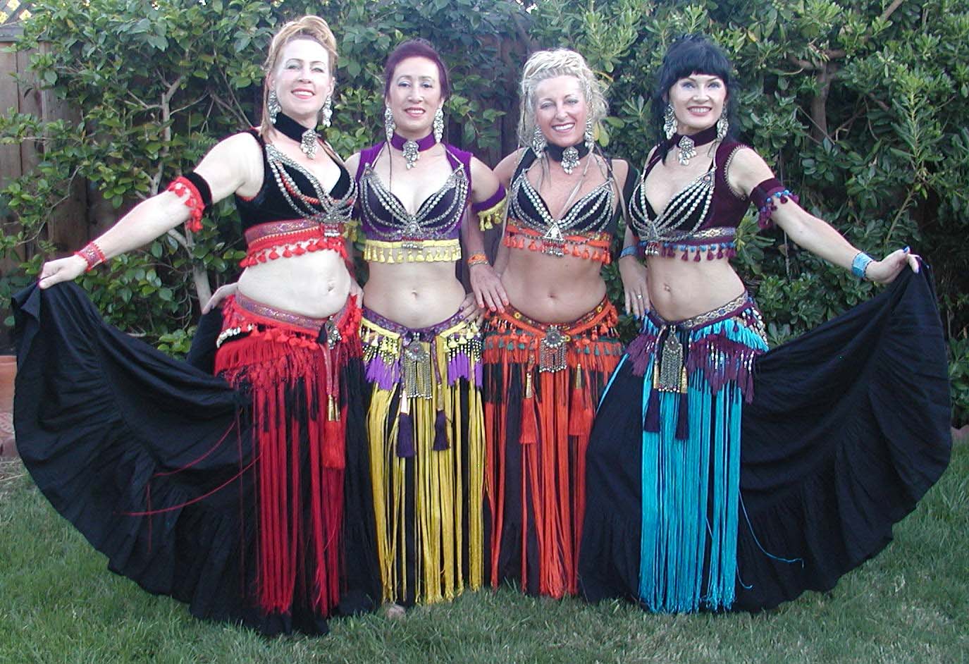 The Troupe wanted a more modern glitzy look to reflect their more traditional cabaret line-up of dances. Bahira selected lamé and eyelash fabric to make them sparkle and Zora's Personal Seamstress sewed vests, harem pants and straight skirts. Bahira fashioned the bedlah from multicolored starred stretch lycra overlaid with gold netting. Bahira added reciprocal colored, long Mylar tassels to the belts for the maximum flash of glitter during dancing. (Photos courtesy of Duane Stevens)