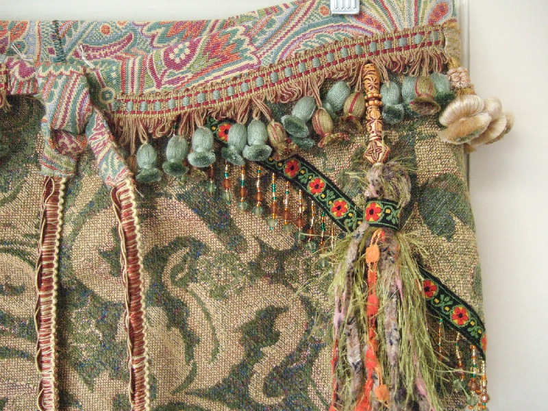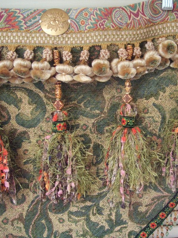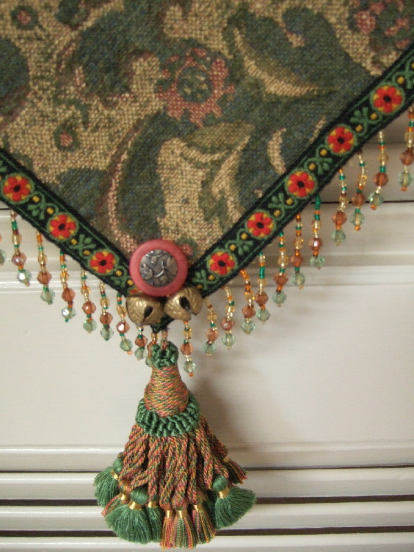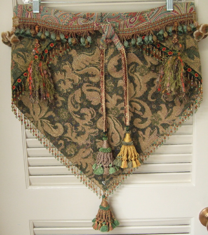 The pattern on this fabric is a stylized floral in olive with pale orange accents, hints of which are found in the trim and hand-made tassels. Hip band is darted and 10 inch tassel ties can adjust to a medium to medium-large hip size.