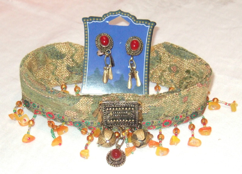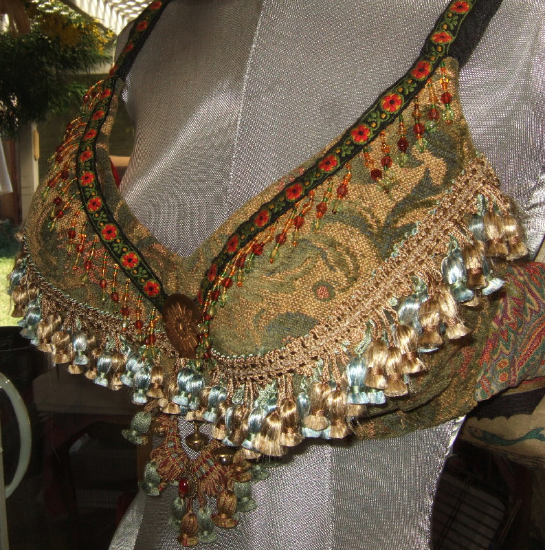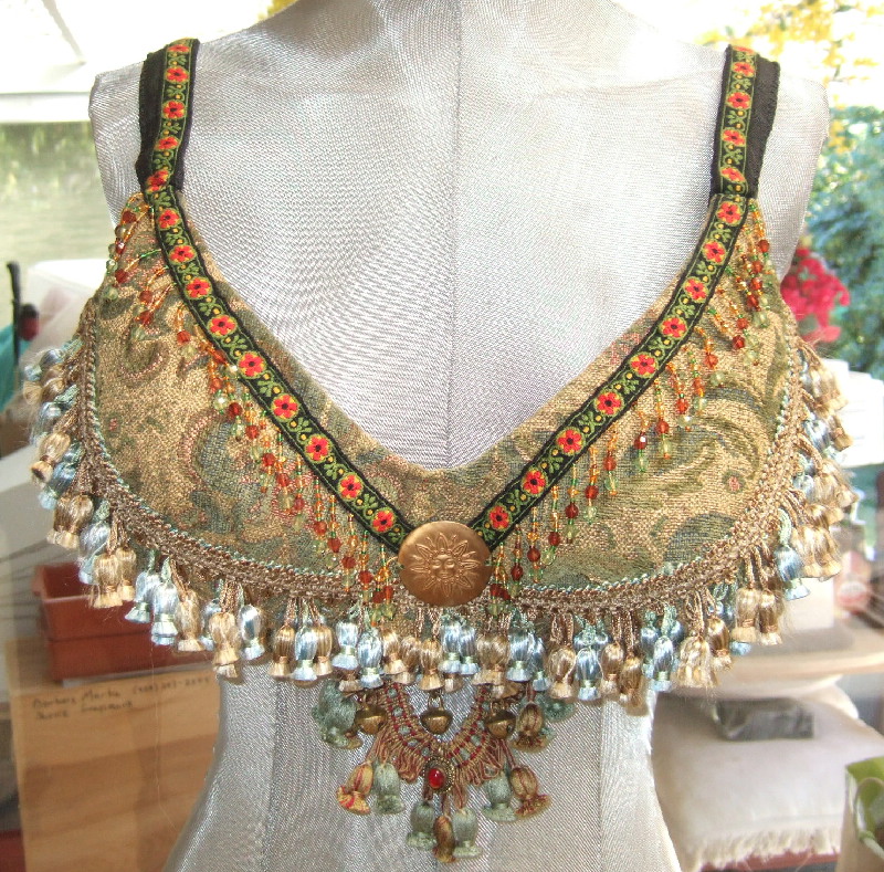 As is true with all of Bahira's tribal belts, a matching bra top can be fashioned from the remaining fabric piece and trims. You provide a suitable bra base in your size and Bahira will construct a matching one-of-a-kind top to complete the costume