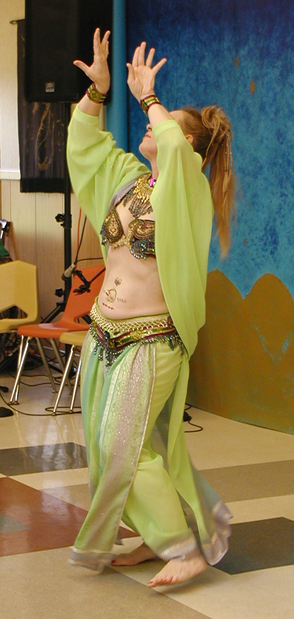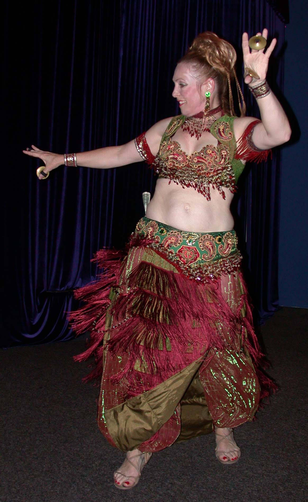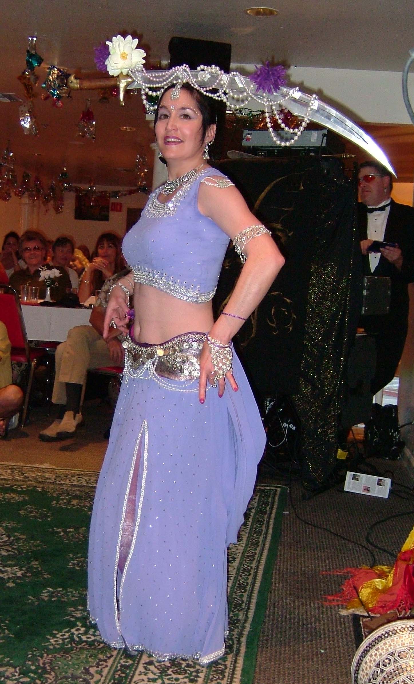 Bahira created the purple, green and gold bedlah & jewelry to compliment the Salwar pants, panel skirt & bolero jacket created by Zora from sari material. Bahira performs at a Bay Area MECDA Hafla in 2004.
