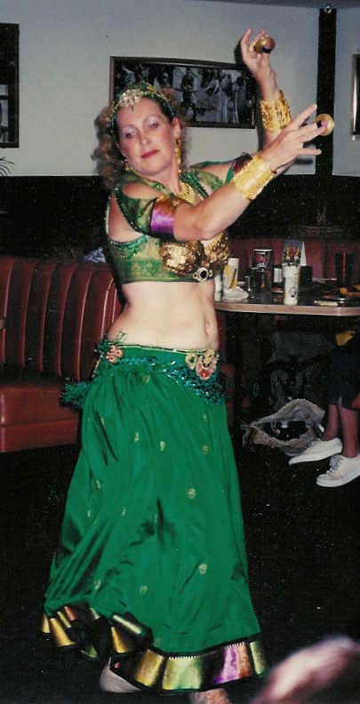 This Emerald Green costume was created from an Indian Sari given to Bahira by her good friend Kay Brown. Bahira created the skirt with 16 triangular panels sewn together in order to have the iridescent sari border at the hem of the skirt. The vest, also made by Bahira, has sleeves that are detachable. Bahira is performing here in a solo at the Straw Hat Pizza in San Jose, California.