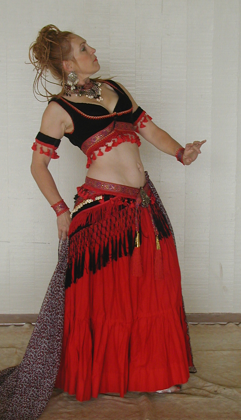 This ensemble was the template for Troupe Nambah's second troupe costume. Bahira purchased the vest at Rakkasah from Domba and the 3-tiered skirt from Flying Skirts. Bahira created a gypsy triangle belt, cuffs and armbands to compliment the vest.