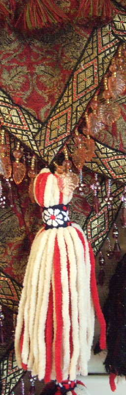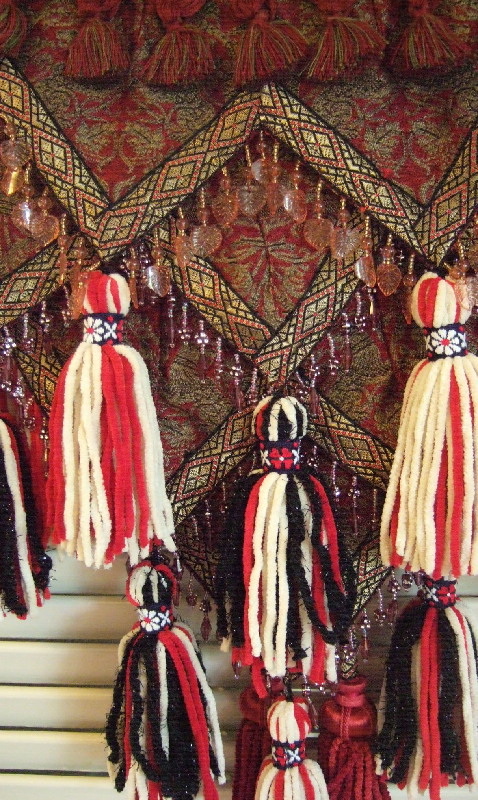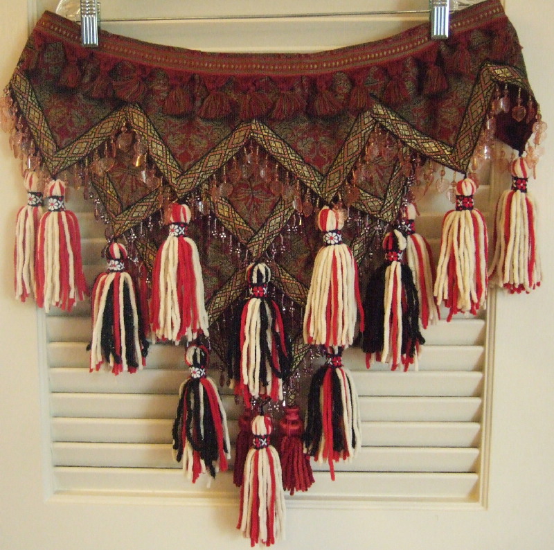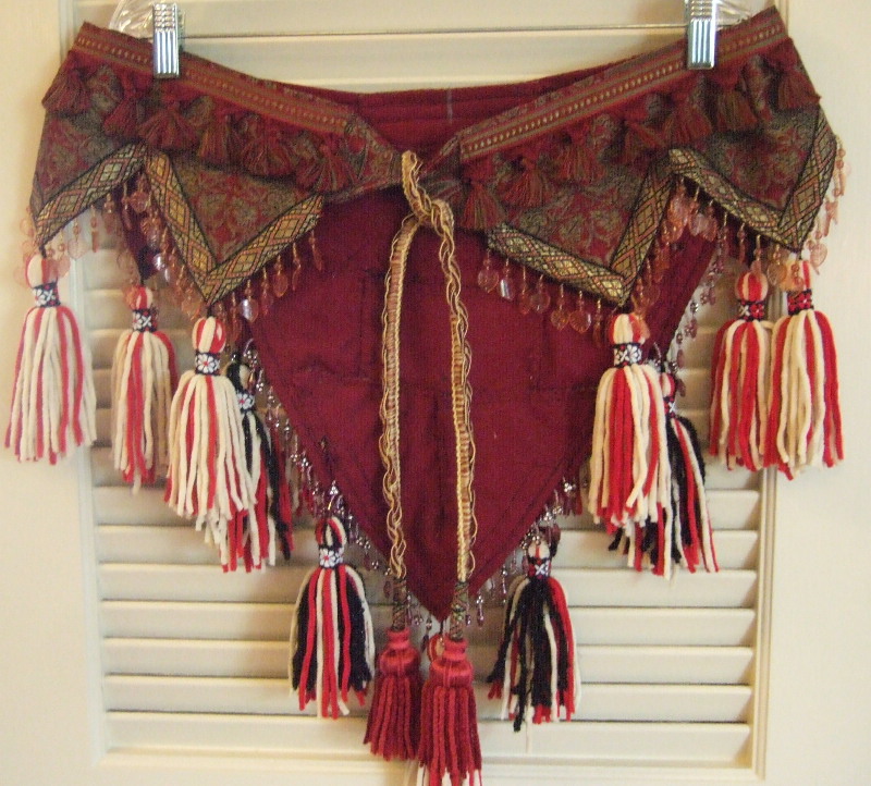 Four layers of beaded fringe petals in red, gold & black brocade fabric with a royal lion coat-of-arms pattern. A great deal of hand work was used to create the layered look. Petals continue around to the front of the fitted hip band. Fourteen hand-made micro-suede tassels cover the belt and give great accent to movement. Extra long tassel ties adjust from medium-large (40 inch) to large hip size.